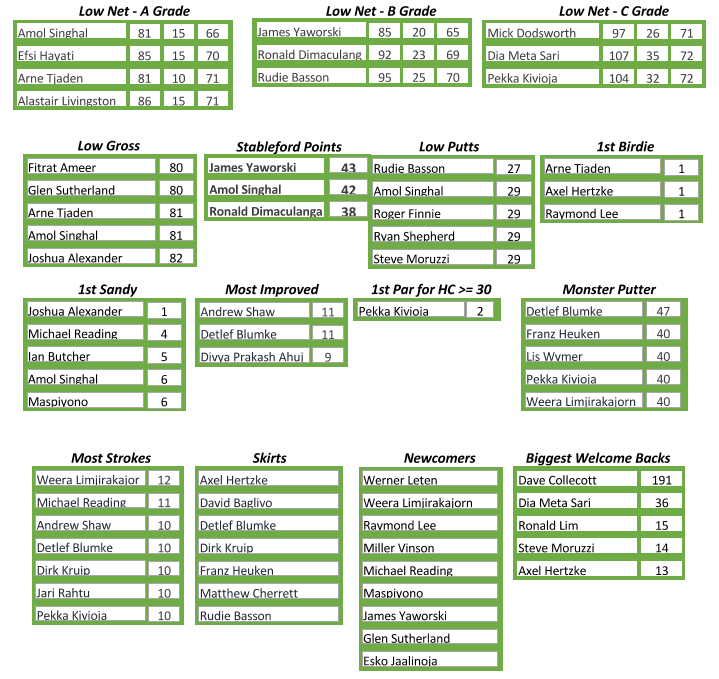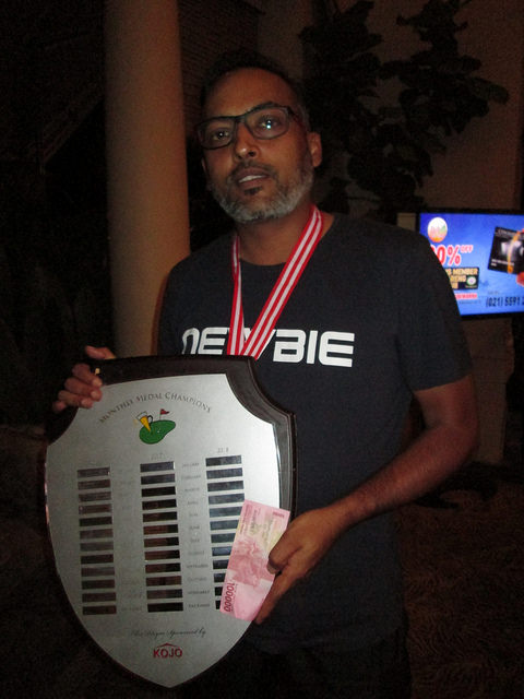 On the monthly skill prizes, nearest the pin was taken by Dia Meta Sari who got the ball to an impressive 3cm from the cup whilst our long drivers of the day were Wina Nguhara and Axel Hertzke who hit and impressive 151m and 242m, respectively. Our main winner on the day, continuing his good recent form, was Amol Singhal who shot an excellent 81 gross for 42 points to take home the Monthly Medal and add his name to the roll of honour on the shield.