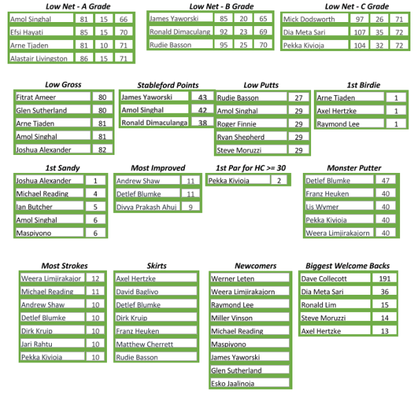 Low Gross went to Fitrat Ameer who beat new comer Glen Sutherland on a count-back after both shot rounds of 80. Low Net prizes were presented by our sponsor Ken Runyon with Efsi Hayati taking how Low Net A (70), Ronald Dimaculangan Low Net B (69) and Mick Dodsworth Low Net C (71)