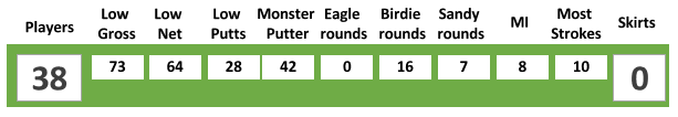 With the later start and the concerns on finishing, a local rule for the day was introduced setting the maximum score at double-par which allowed some to pick up as needed and keep the groups moving. As a result, we did not award Monster Putter or Most Strokes on the day and, with there being no skirts either, our treasurer was left empty handed on the booby fines front. On the flip side, with us playing off the white tees in perfect golfing conditions, the better players on the day made hay with some excellent scoring being recorded both net and gross.