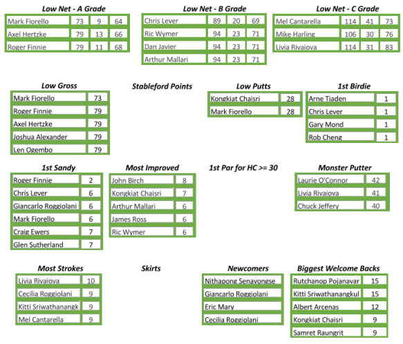 Low Putts went to Kongkiat Chaisri for his excellent mastery of the greens in taking 28 putts in his round. Mark Fiorello had the round of the day with a Gross 73 but with him taking Low Net A, a 4-way tie breaker was needed for Low Gross with Roger Finnie eventually being taking home the prize over Axel Hertzke, Len Ogembo and Joshua Alexander.