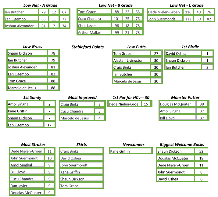 Shaun Dickson recovered from his skirt to shoot an excellent 78 and take home Low Gross whilst both Tom Grace and Dede Nielen-Groen also overcame their earlier difficulties to secure Low Net B (66) and Low Net C (76), respectively. Taking Low Net A but absent at photo time was Ian Butcher after a net 67.