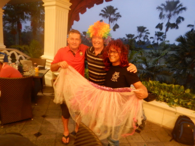 12 was the key scoring number of the day, Dirk Kruip racking up that number of strokes on a hole to take the Monkey whilst Kane Griffen improved by that number between the front and back nines to take home Most Improved. A 3 way tie for Monster Putter between Brandon Curson, Ric Wymer and Wahyu Budi saw the treasurer go home happiest whilst our 1 photo of the prize giving did capture our skirts: Tom Grace, Wahyu Budi and Richard Green; Al Livingston having to already depart.