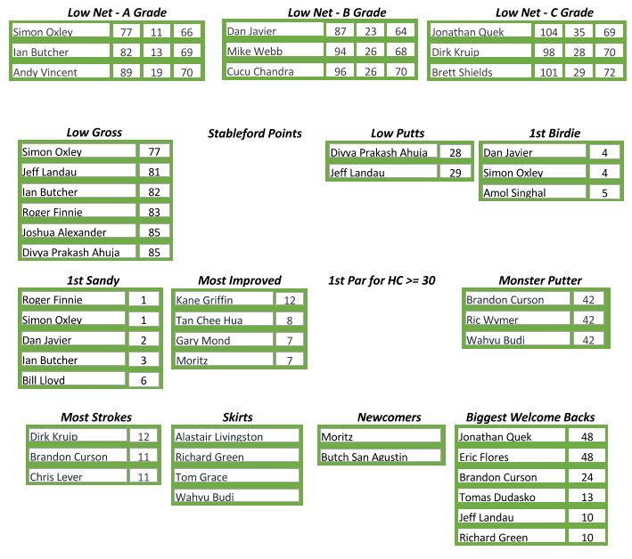 Round of the day went to Simon Oxley who had his best ever score of gross 77 to take home Low Net A with a net 66. An equally impressive net 64 by Dan Javier saw him take home Low Net B honours whilst a modest net 69 saw Jonathan Quek win Low Net C.