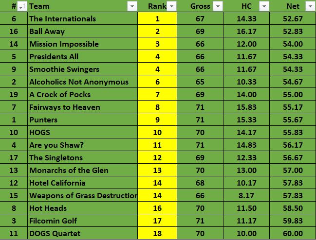 On the team prizes we had the remarkable return of all 18 teams having a gross score of under par – last year it was 10 teams from 22! Therefore the team prizes came down to the odd missed putt or unlucky bounce with less than a stroke covering most of the prize places for 1v2 and for 3rd place.