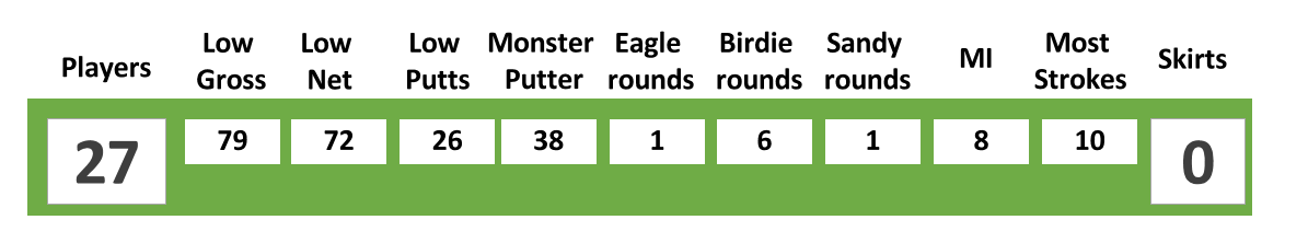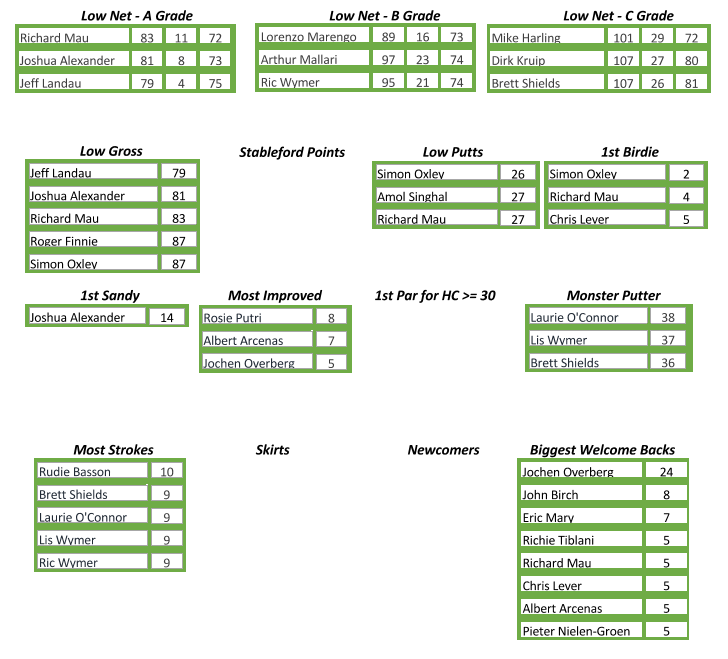 Low Putts went to Simon Oxley for his return of 26 strokes on the greens and First Birdie to Chris Lever for his effort on hole 5. Low Gross on the day went to Jeff Landau for his 79 off the stick.