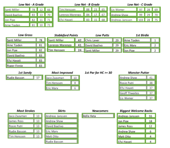Low Putts was awarded to Chris Lever for his 29 strokes on the greens and Low Gross to Arne Tjaden for his 81 off the stick.