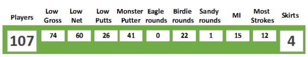 No fines this week so a week off for the Tee Set dress up bag but we did still recognize our usual skill prizes. First Birdie went to Lina Bunter, 1st Sandy to Nuri Puzey, First Par for handicaps >=30 to Renny Sperry and joining the ladies was Brad Burness for Low Putts.