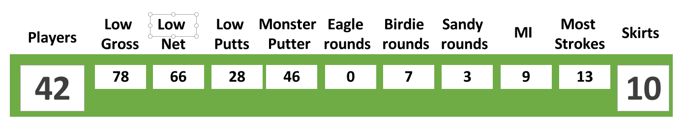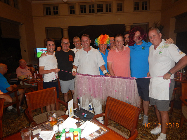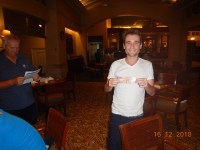 A 25% hit rate saw a bumper photo of 10 skirt winners with Chris Chipman, Craig Ewers, Detlef Bluemke, Eric Mary, Ian Butcher, Matt McGowan, Mick Dodsworth, Rod Ritson, Stefan Thiele and Tim Henssen all in the frame. Several were to return as winners later in the prize presentation although Rod and Chris were to remain for a second booby prize photo after securing Most Strokes (13) and Monster Putter (46), respectively.