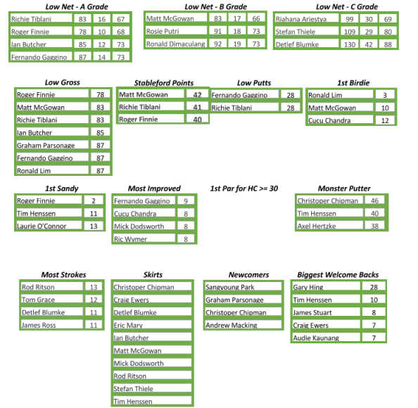 Our Low Net winners were Richie Tiblani (A Grade net 67), Ronald Dimaculangan (B Grade net 73 after a count-back from Rosie) and Riahana Ariestya (C Grade net 69).