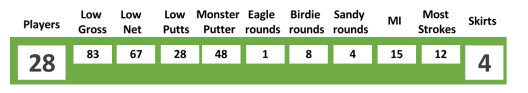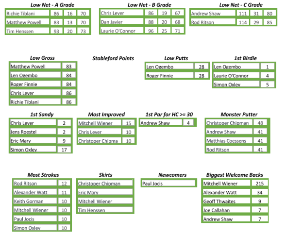 Clearly having a better back nine after getting used to the President’s spare clubs, Mitchell Wiener recovered his fine by taking home Most Improved of 15 strokes. First (& only) Par for Handicaps >=30 went to Andrew Shaw for his effort on hole 4 whilst Jens Roestel took home First Sandy for is par on hole 2. First Eagle went to Len Ogembo who pitched in on hole 18 whilst Low Putts went to President Roger Finnie after his return of 28 putts.