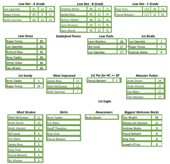 Low Gross went to President Roger Finnie for another consistent round of 80 whilst Low Net went to Len Ogembo (A grade 71), Andrew Waite (B grade 72) and King Tirto (C grade 74).