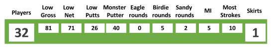 Most strokes was a modest 10 but shared 3 ways with Arthur Mallari, Lorenzo Marengo and Mikko Heinonen whilst Monster Putter was taken by Jack Harkness after his 40 putts on the greens. Despite the best efforts of a wayward drive and tree rebound back to the edge of the red tees which almost gave the President his 2nd skirt, he remained fortunate much to the disappointment of his playing partners and so VP Ric Wymer was left to enjoy the dress up photo alone this week as our only skirt on the day. Most Improved went to Tim Knight whilst Indar Dhaliwal won First Par for Handicaps >= 30.