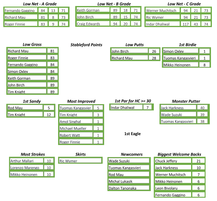 2 newcomers in the money with Rod Mau winning First Sandy Par on hole 5 and Tuomas Kangasvieri joining Simon Oxley for a first hole Birdie and winning that prize. Ensuring family harmony was Richard Mau taking home Low Gross for his 81 off the stick.