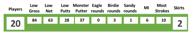 Our small group meant that almost everyone managed to get their name in the highlights sheet. A 3 way tie for Most Strokes of 10 by Matt Otto, Jari Antikainen and Indar Dhaliwal and 2 skirts by James Ross and Mike Webb ensured the Treasurer could collect some fines as despite the greens condition, no Monster Putter was recorded on the day. With the Clubhouse being quiet, some of the staff decided to photo-b0mb our prize giving as can been seen in the pictures.