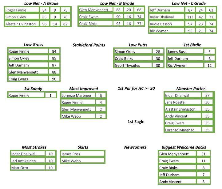Our Low Next prizes went to best net of the day Jeff Durham, a clearly not too rusty Glen Menyennett and to Roger Finnie.