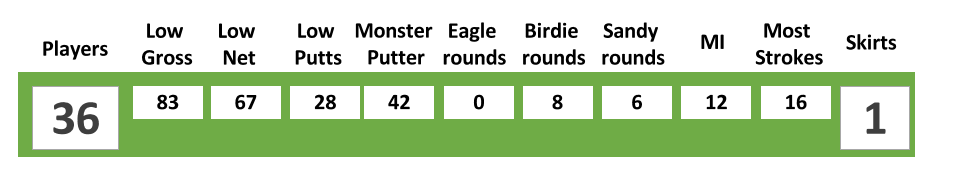 Last seen struggling on one hole, we were pleased to see Rudie Basson back in time to participate to the prize giving in being recognized for his Most Strokes of 16 on a hole. Only 1 skirt on the day as a rusty Tom Grace got to enjoy the dress up outfit to himself whilst Andrew Clydesdale and Joe Callahan both struggled on the recently cored greens and racked up 42 putts to share Monster Putter.