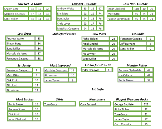 Most Improved was Matthias Coessens who was 12 strokes better on his second 9 whilst First Sandy and First Birdie went to Matt Otto and Fernando Gaggino, respectively