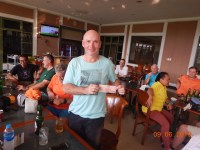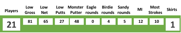 Almost everyone made it to the results board this week but as usual we started with our booby prizes. A lone skirt for the day to the otherwise big hitting Simon Oxley saw him with a choice of wigs to match his T-shirt for the usual photo. Joining Tee Set for a second week and up again for Monster Putter, Pepi Kurniawan also shared Most Strokes with the returning Lina Bunter.