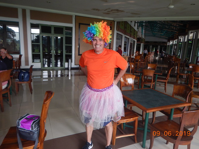 Almost everyone made it to the results board this week but as usual we started with our booby prizes. A lone skirt for the day to the otherwise big hitting Simon Oxley saw him with a choice of wigs to match his T-shirt for the usual photo. Joining Tee Set for a second week and up again for Monster Putter, Pepi Kurniawan also shared Most Strokes with the returning Lina Bunter.