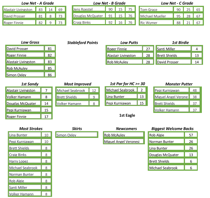 Also up for a second time in 2 Tee Set outings was Volker Hamann who won First Sandy whilst Most Improved went to Brett Shields and First Par for Handicaps >=30 went to Michael Seabrook.