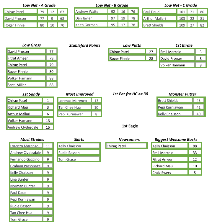 Lorenzo however used his Most Strokes on the front 9 to win Most Improved and recover his fine. First Birdie went to Emil Marcelo and Low Putts to Chirag Patel whilst Richard Mau won First Sandy.