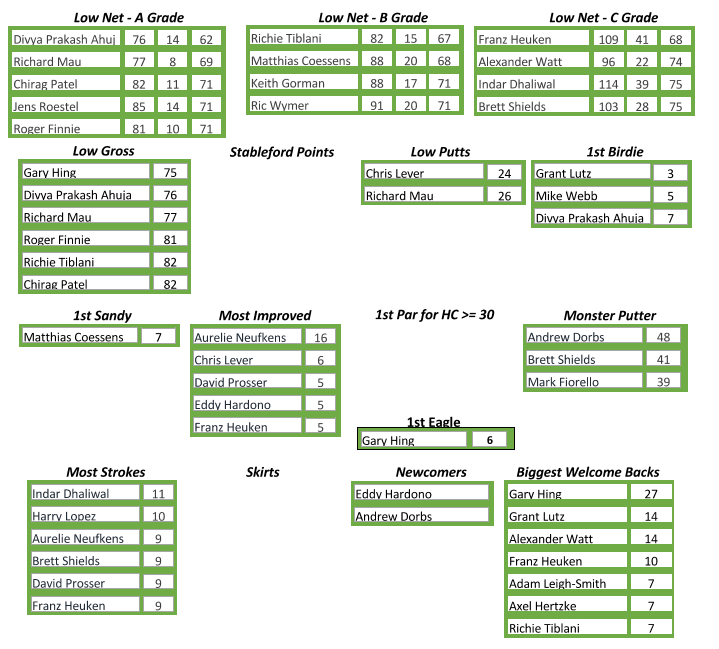First Birdie went to Grant Lutz whilst our double prize winner was Gary Hing who had an eagle on his way to best gross of the day of 75. Our Low Net winners were Divya Prakash Ahuja after a best net of the day 62 where he was joined by Richie Tiblani and Franz Heuken.