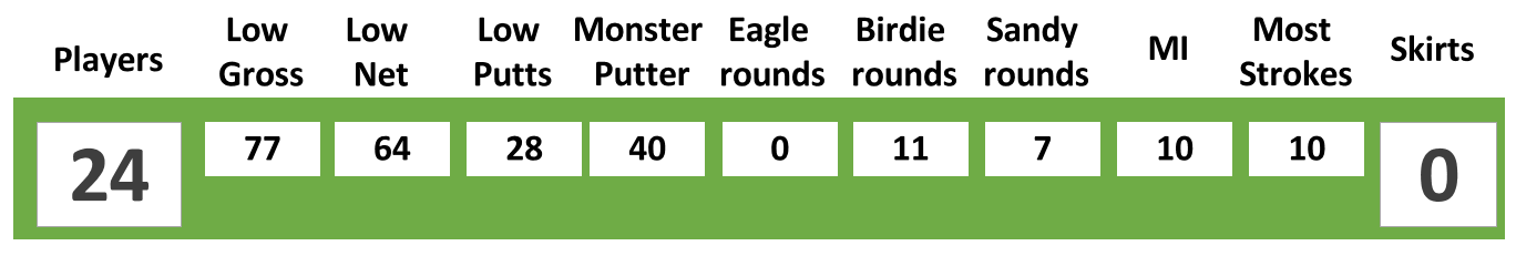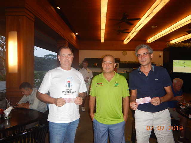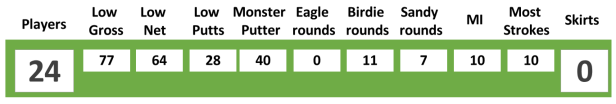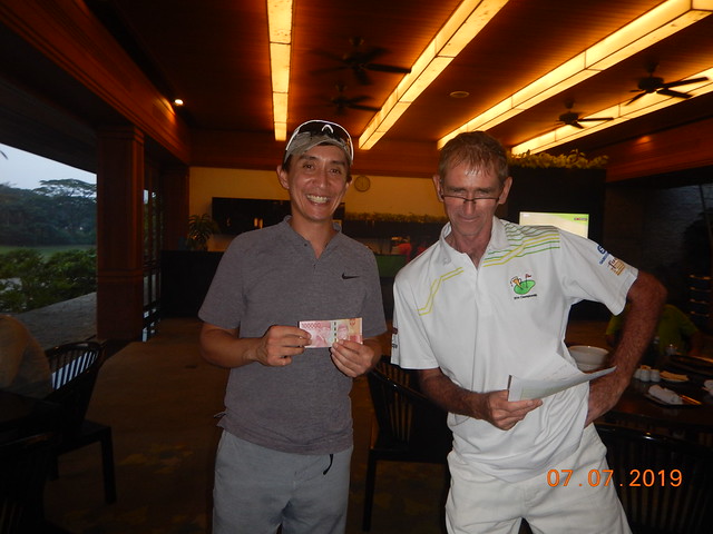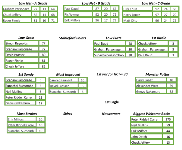 No skirts this week but the Treasurer was pleased to note a 3-way tie for Most Strokes with our welcome backs, Peter Riddell Carre and Erik Milfors being joined by Supachai Suesomboon who however won his fine back with Low Putts. Monster Putter was Harry Lopez . Most Improved went to Samret Raungrit.