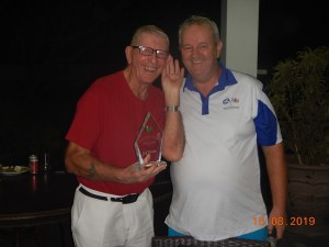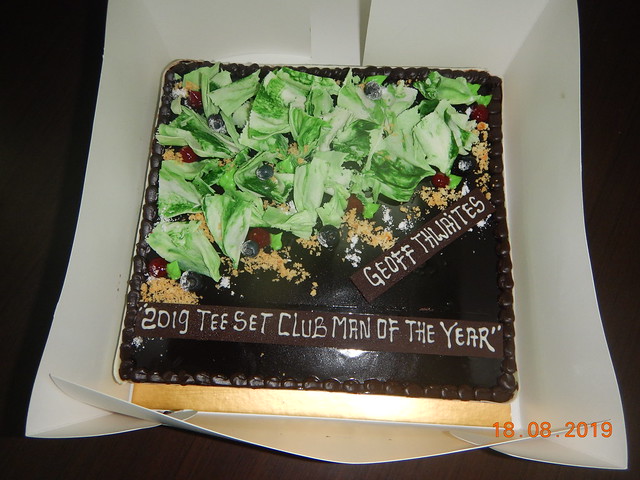 In addition to the prize giving for the day, we also had one presentation delayed from the scramble day due the absence of former President Geoff Thwaites that week. Geoff was presented with the Clyde Wickiser Memorial Trophy as our Club Man for the year and received a well earned ovation from all present as well as a cake to mark the occasion kindly donated by Richard Mau.