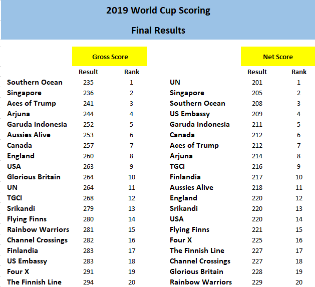 Winners of the Low Net and the World Cup Trophy for 2019 was our UN team of Mark Fiorello, Jude Alexander, Billy Variava and Jaco Zaayman with Singapore (Peng Siong, Alfred Lee, Victor Tang, Wishnu) and Southern Ocean (Mark Scheide, Gavin Webb, Gary White, Rob Nicholls) taking the runners up spots.