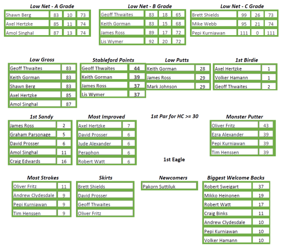 Taking home a tri-fecta of booby prizes this week, Monster Putter & Most Strokes awardee, Oliver Fritz, was joined by 3 of our big winners on the day, Brett Shields, David Prosser and Geoff Thwaites, for the Skirt photo. Most Improved was shared this week between Peraphon and Jude Alexander.