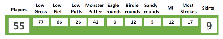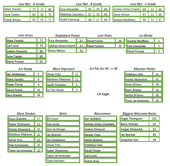 With Oliver having departed, Matthew Makarenko was to recover his fine with Most Improved whilst the ladies cleaned up on our “1st” awards, Santi Miller for 1st Sandy and Aurelie Neufkens for 1st Birdie – both on the First!. Low Putts went to newcomer David Foong.