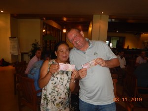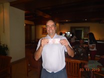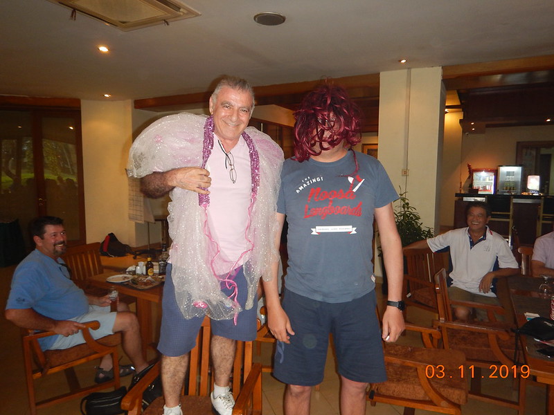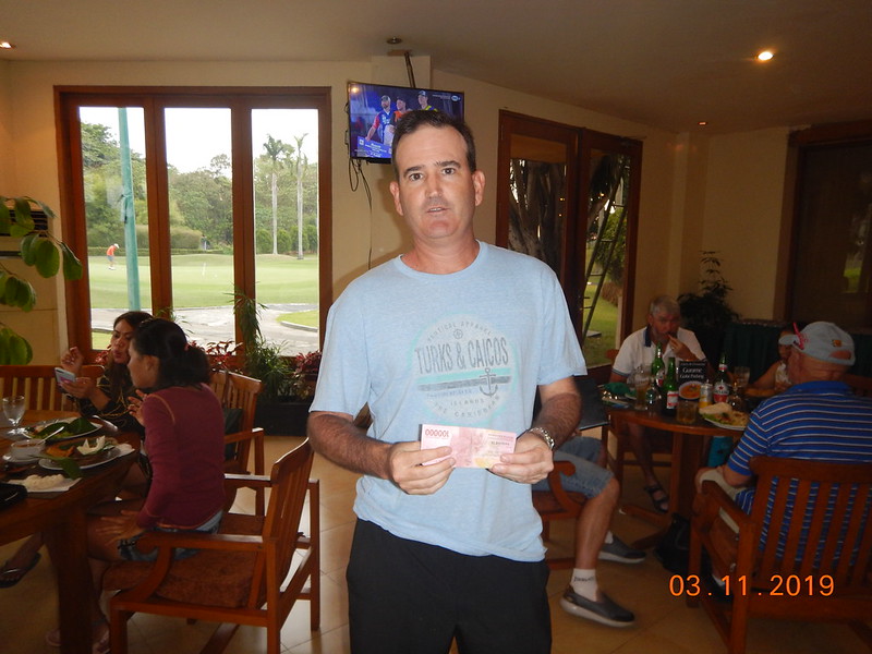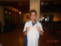 Gading Raya is a friendly, fairly flat course but still with the capability to catch the unwary and our 3-way tie for Most Strokes of 10 between Simon Oxley, Joe Alchi and Frank Wilson pleased the Treasurer after the rather low return of 2 skirts from Joe Alchi and newcomer Andy Coop. A welcome back but clearly not having practiced with the flat stick in between games saw Maurice Dres claim Monster Putter after 47 strokes on the greens. Joe however was able to recover his fine by claiming First Par for Handicaps >=30.