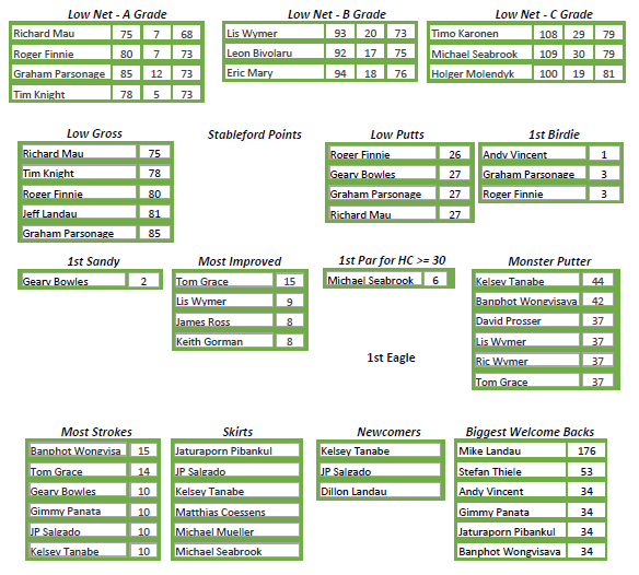 Whilst the conditions were quite favourable, the overall challenge which Modern presents, particularly when not completely dry and rolling fast on the fairways, was reflected in the fact that only 1 player was able to beat their handicap on the day. With VP Ric Wymer having omitted the Tee Set bag from his packing this morning, our fine winners were spared the dress up accessories on the day but not the pleasure of being recognized in the prize-giving. 7 skirts were secured on the day shared between Axel Hertzke, Jaturaporn Pibankul, JP Salgado, Kelsey Tanabe, Matthias Coessens, Michael Mueller and Michael Seabrook. Kelsey was back for Monster Putter while Most Strokes was awarded to Banphot Wongvisava.