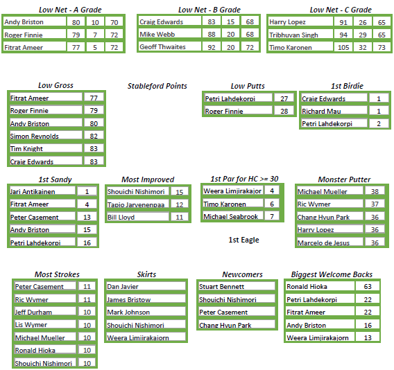 Weera, First Par handicaps >=30, and Shouichi, Most Improved, were both up again to recover their fines. Petri Lahdekorpi was our master of the flat stick this week as Low Putter.