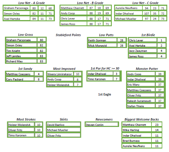 No Monster Putter this week but a 3 way tie for both skirts and Most Strokes kept the treasurer happy. Oliver Fritz was joined by Michael Mueller and David Baglivo for the skirt photo and by Timo Karonen and Holger Molendyk for Most Strokes. Indah Dhaliwal secured First Par for Handicaps >=30 and Weera Limjirakajorn was Most Improved.