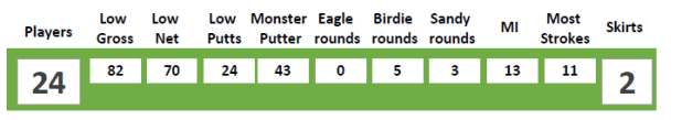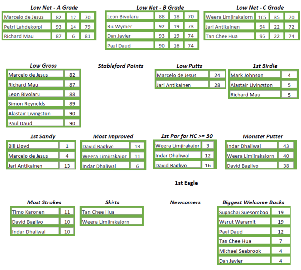 Obviously refreshed after the rains, David Baglivo took home Most Improved whilst Indar recovered his fine with First Par for handicaps >=30. Missing out on First Birdie after his 3rd shot landed directly into the hole from the fairway only to bounce out, Bill Lloyd nevertheless sank the putt for First Sandy having been in the fairway bunker off the tee. Jari Antikainen took home Low Putts and Mark Johnson First Birdie.