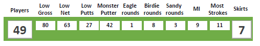 Despite the soft conditions, only a “usual” number of skirts returned on the day with Cory Packard, Craig Edwards, Doug McQuater, Ezra Alexander, Indar Dhaliwal, Mike Riley and Timo Karonen all sharing the dress up outfit. Jude Alexander was our Most Strokes awardee and Lis Wymer Monster Putter.