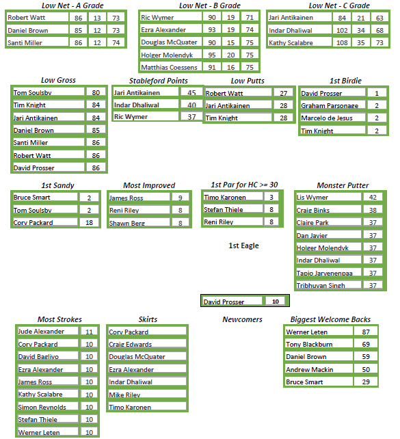 Timo Karonen has made First Par for Handicaps >= 30 his own recently to win back his fine whilst Most Improved went to James Ross and 1st Sandy to Bruce Smart. Dave Prosser had our only Eagle but on his 19th hole in the match play so was not able to be awarded for this; however he also secured 1st Birdie so did not go home empty handed