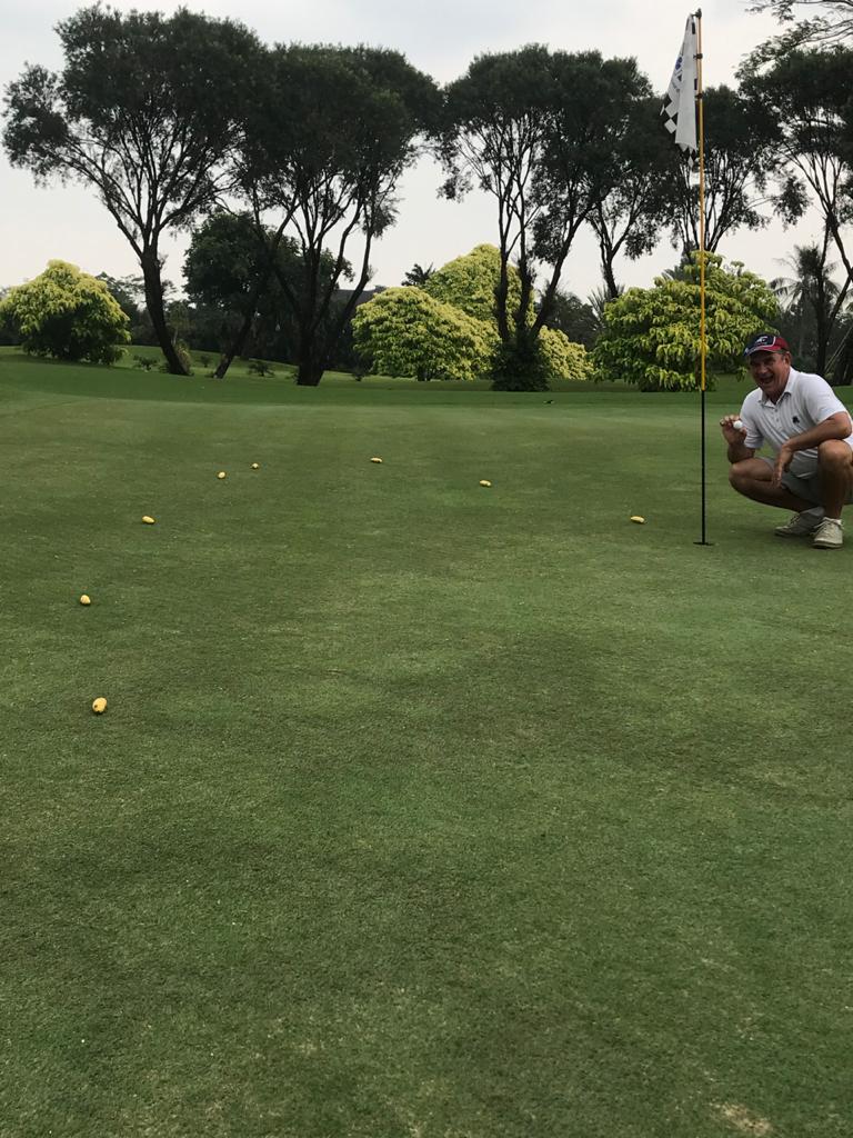 Congratulations to VP Bill Lloyd for his Hole-In-One last Sunday at Bogor Raya. Bill is seen here picking the ball out the hole on 11th green with a truly local track-man of the shot being laid out on the green thanks to Richard Mau’s recently purchased hand of bananas. Bill was able to celebrate his 2nd ever hole-in-one with everyone who joined him at the restaurant afterwards.