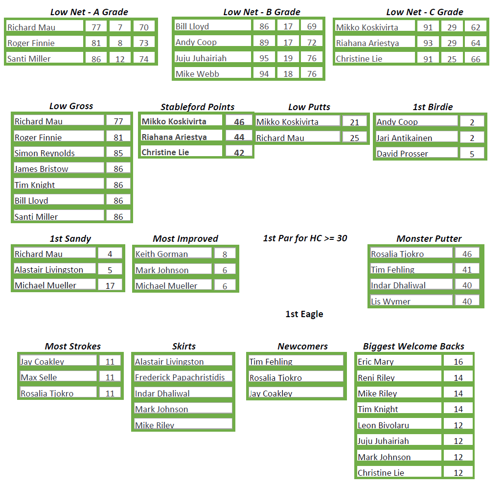 As mentioned we did a very curtailed prize-giving so all the winners from the regular prizes will be receiving their prizes at a future event…. As will our actual Monthly Medal winner Mikko Koskiverta who had made an error in adding up his scorecard which we only picked up on when entering scores today, meaning he and not Hana Ariestya took home the shield. Thank you to Hana for her understanding on the matter and we will arrange the photo with the shield next week Mikko.