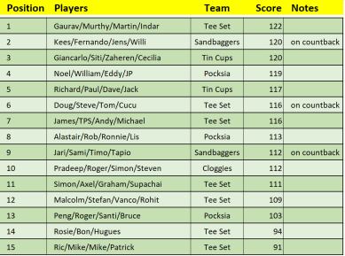 Overall we had 59 players which was a little down on expect numbers after a few late call offs and some no-shows on the day but those who came were blessed with a course in fine condition and a very relaxed evening in club house afterwards. The rain largely stayed away with only a couple of holes affected by a light shower and the journey home was quick and smooth so fears on both counts were unfounded despite it being the rainy season and the end of a long week-end.