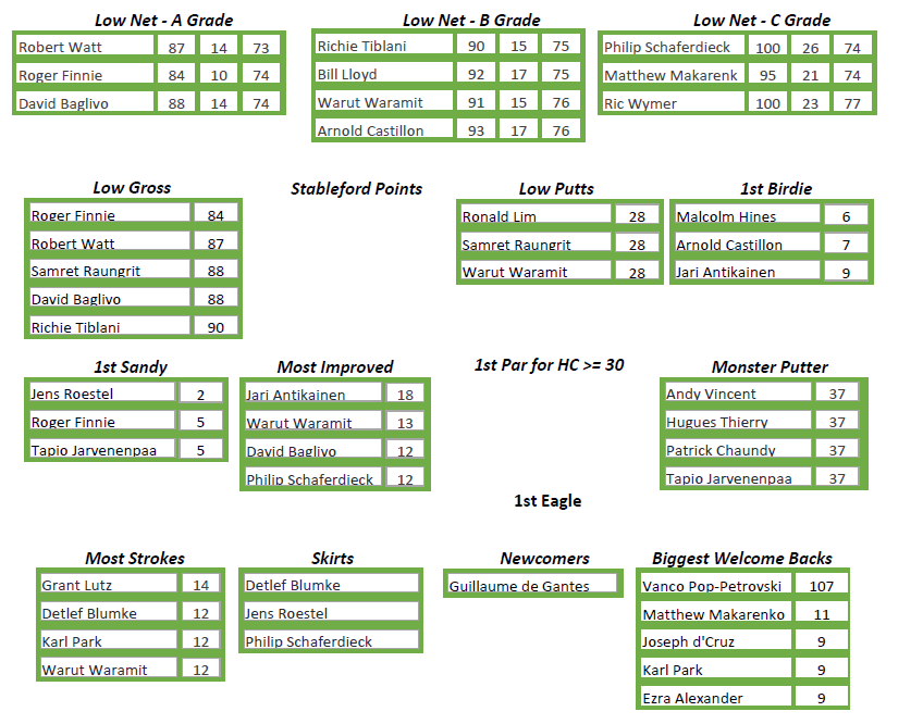 First Birdie was secured by Malcolm Hines whilst we had a 3 way tie for Low Putts with Samret Raungret, Warut Waramit and Ronald Lim all being awarded the prize whilst Roger Finnie showed his recovery is on track securing Low Gross.