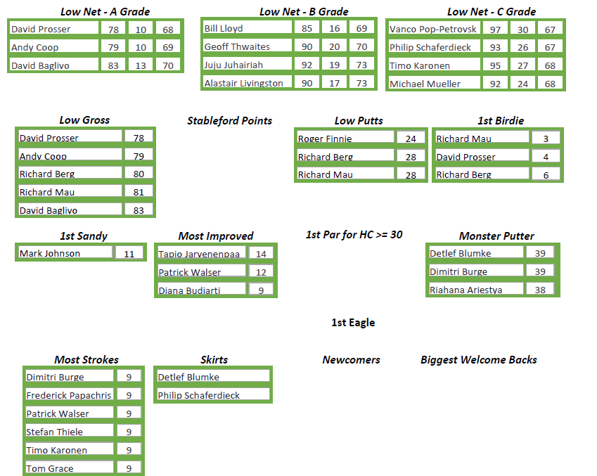 The softer greens after the rains ensured that we had no Monster Putter this week but this was more than made up by the 6 way tie for Most Strokes involving Dimitri Burge, Fred Papachristidis-Bove, Patrick Wasler, Stefan Thiele, Timo Karonen and Tom Grace. A modest return of 2 skirts also kept the Treasurer happy too, thanks to Detlef Bluemke and Philip Shaferdieck.