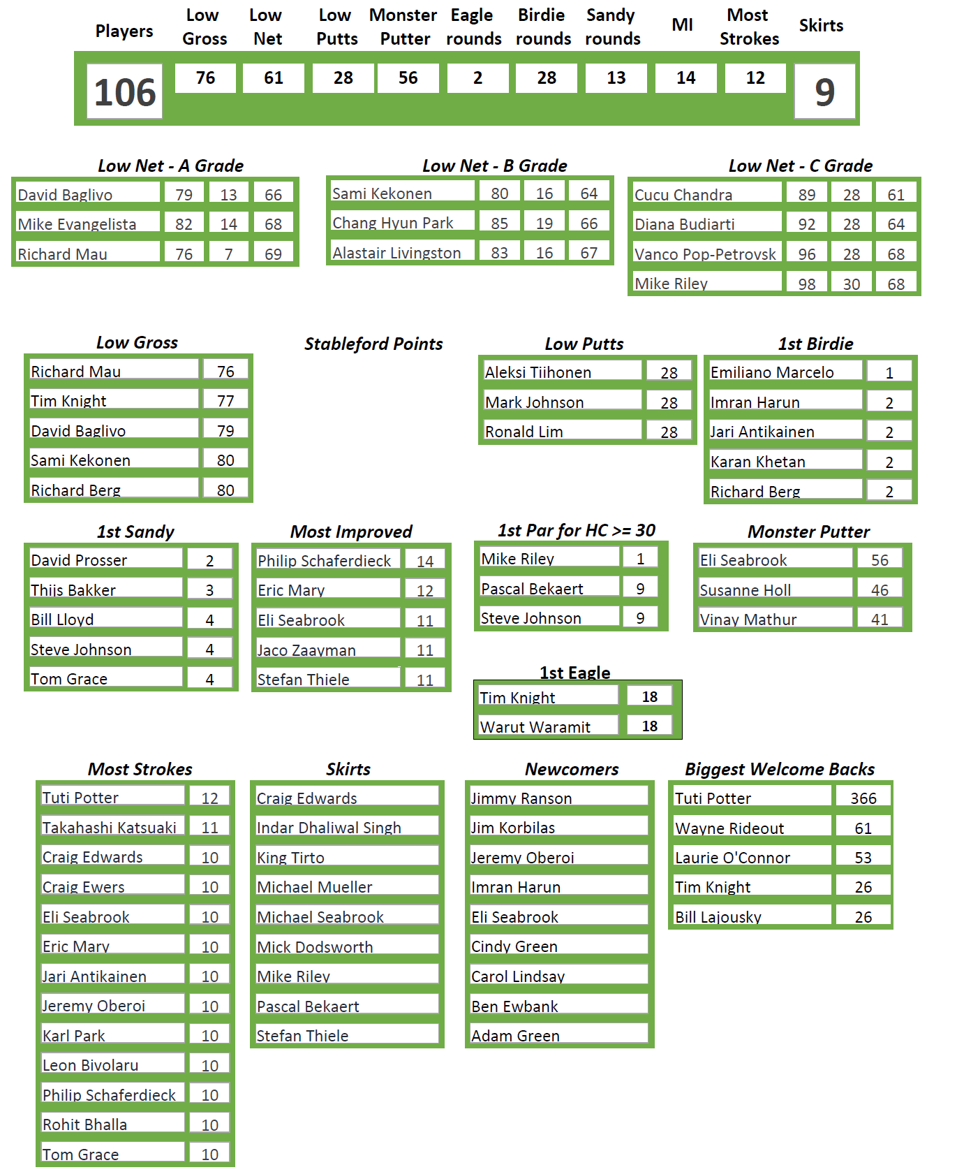 A full range of statistics were provided, thanks as usual to our mysterious Web Guy for his painstaking adherence to data integrity, and these allowed us to award prizes for Lowest Average Gross over the Year – Simon Reynolds – with 23 rounds played for an average gross score of 80.7, Lowest Average Nett over the Year – Roger Finnie – with 36 rounds played for an average nett score of 73.3. Roger also took out lowest average puts with 28.7 per round. As usual, our stalwart Ric Wymer won the Iron Man with the most rounds played, 47, lower than his usual because of a bout of dengue fever.