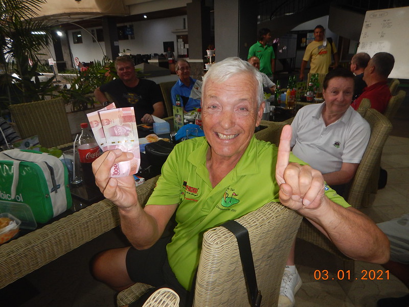 Sam took Low Gross with 79 and insisted to pose here in front of a stunning orchid. Andy again flew the Coop before prizes to return to his room and practice his putting; stay tuned for his new book Putting in Quarantine. Long time Tee Setter and sponsor Bob, eventually found some form on the back nine to claim Most Improved. Rudy used his elevated handicap to advantage to pick up First Par among the 30 and overs. Rosie was first in for the First Birdie on her first hole. And the ever suave Gaurav, as he does most weeks, featured in the winnings, this time with First Sandy Par.