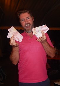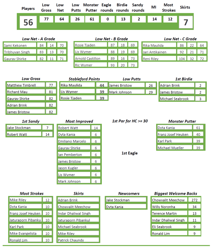In the Monthly Medal Competition, Rika (above) blitzed the field, hubby Matt won Low gross with a very solid 77, Sami and Lis (pictured somewhat awkwardly here – not sure what’s going on) took A and B on count backs and Jari, who currently squeezes into C Grade, took the honours there. Adrian continued his cash bonanza with another prize for longest drive (255m/280 yards) joined by Juju (168m/185yards). Bristow, James Bristow, took Low Putts with an outstanding 26. Michael, who I think was overlooked on the day, was later awarded first Birdie (cheque is in the mail, mate), after Adrian and Jari won other prizes – his picture snuck in here with COVID hair. Robert (in my favourite photo of the day) won Most Improved (aka Last to Sober Up), Jake took first sandy and Dougie – who left before prizes, I’m told, to get more Scotch – took Nearest to the Pin (164cm/66 inches).