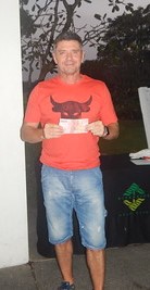 After deserting the captaincy of Tee Set to captain JAWS, reportedly in a lucrative transfer deal, Simon led his new team from the front with a fine 76, returning to Tee Set briefly to collect our Low Gross award…and looked rather happy about it in the picture below. Rika, a regular feature in our winners’ circle, made up for countback disappointment in C grade to take First Sandy. The First Birdie went to Dave, who also took out Longest Drive in the Inter League. Mike topped the putting with 26 Putts and topped B Grade scoring, a double top, but missed the B Grade prize to Jude on a countback. The last to wake up, or the Most Improved by 10 strokes, was awarded to Phillip, who returned some of his winnings later for Most Strokes on a hole. Phillip was also part of the most lively table today, featured heavily in the social photos, which are hidden away here.