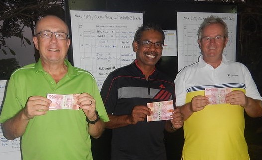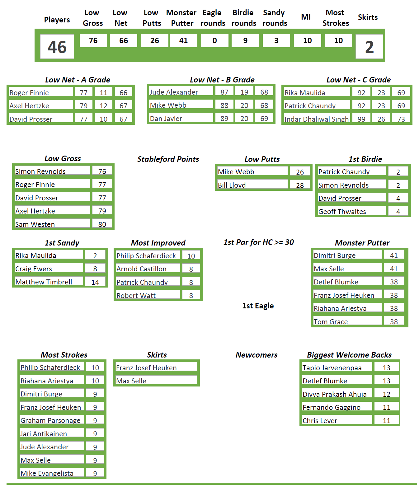 On a date that sounded like a concert sound check….2-1-2-2-1 (sorry band joke), it was a combined Tee Set/Jakarta Inter League round today, with an estimated 80 players competing, 46 officially submitting cards to Tee Set . Big welcome backs to Tapio and Detlef, always great to see you, as well as Sandbagger El Guapo and JAWS tycoons, Divya and Chris. No newcomers today.
