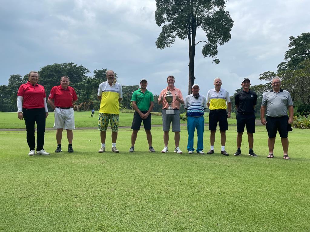 So……first for the Tee Set competition, which was played in parallel with Inter League. It also included some memorable matches featuring two former Presidents, one Whispering who played Jude and the other, Singing, who played Dan the San Miguel Man. Geoff had three birdies but it was still not enough. After a mix of brilliant and woeful shots, both matches were squared going into the last hole. Dan chipped close and made the par putt to win his match and Jude took advantage of some waywardness from The Whisperer to take the honours there, and also win Low B Grade in the net competition on a countback. He was joined in the winners’ circle by the non whispering, non singing, but always collecting, former President Roger taking A Grade with a Net 66, lifted by his responsiblities of leading out the Pocksia team. Patrick joined them taking C Grade on a count back, a very popular winner, Patrick, is a Tee Setter who is happy to be paired as it suits, and as a result has become known quickly to a number of us for his good company and sharp wit.