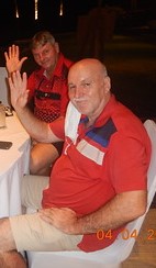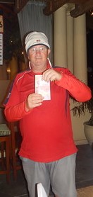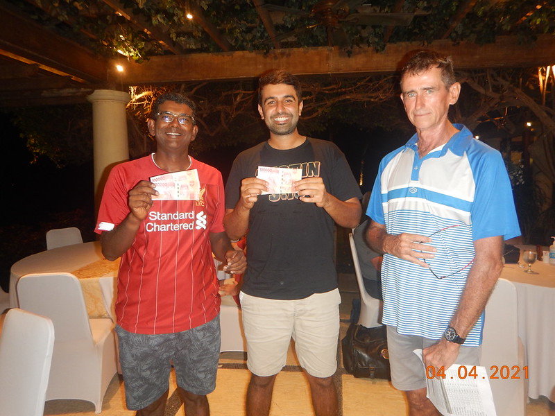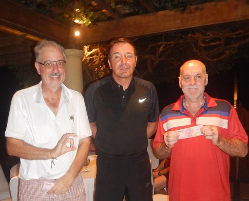 Other winners included a quadrella for first birdie on the second hole – filled with thoroughbreds Dougie, El Guapo, Terrence and James. El Guapo here signalling he is OK; James still thinking about his 10 on the 18th and Dougie, both hands on the cash like a true Scot. Dan shared low putts with Roger and Indar, but won other things, so Dan gets his own shot. Steve took First Sandy – but escaped before prizes, Indar and Dan won other things, so Jeremy was awarded the prize, pictured here after telling Ric a joke, which he got this time. Alas – no skirt photo today – Vanco would have been magnificent in all the gear, but somehow escaped.